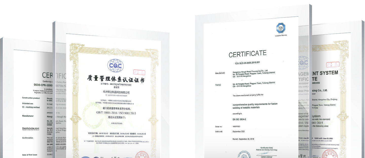 Hengli Manufacturing has won many quality certifications, including ISO3834 international welding quality system certification; ISO9001 international quality management system certification; EN-1090-1 certification.